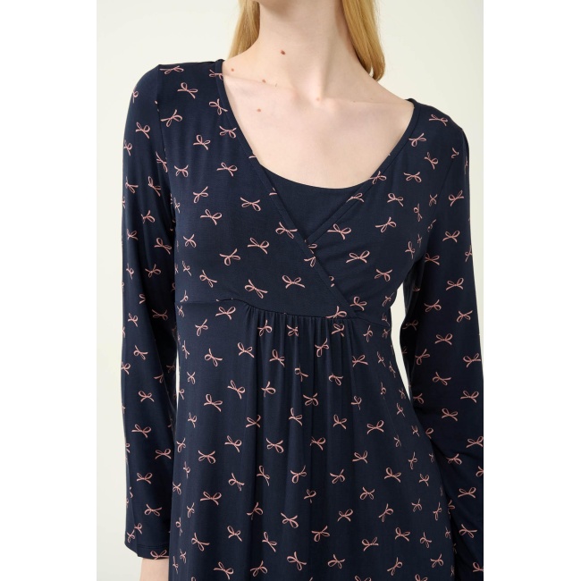 Ανανεώστε τη χειμερινή σας γκαρνταρόμπα με αυτό το νυχτικό, φτιαγμένο από 100% βαμβακερό interlock για απαλή υφή και εξαιρετική διαπνοή. Το κομψό μοτίβο με φιόγκους προσθέτει μια παιχνιδιάρικη αλλά και θηλυκή πινελιά, ενώ η πατιλέτα εξασφαλίζει άνεση και κομψότητα. Με μακριά μανίκια και χαλαρή γραμμή, είναι ιδανικό για ήρεμα βράδια στο σπίτι και στιγμές απόλυτης χαλάρωσης.