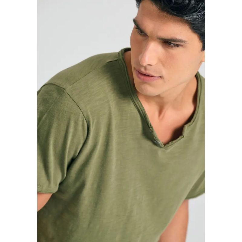 Ανδρικό t-shirt Essentials της εταιρίας Funky Buddha με λαιμό henley & raw cuts λεπτομέρεια
