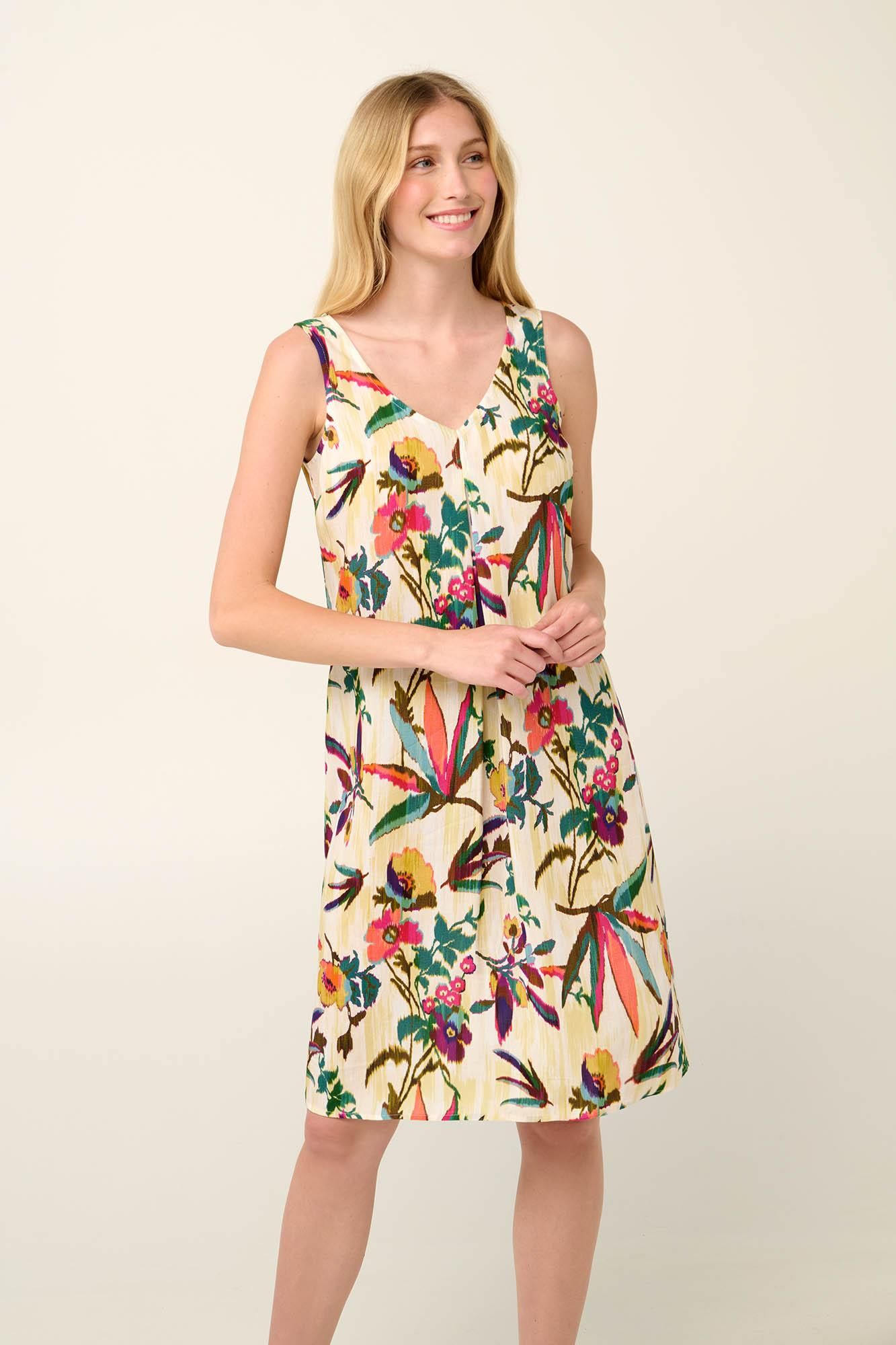 Απογειώστε την εμφάνιση σας με ένα αμάνικο καλοκαιρινό φόρεμα, διακοσμημένο με ζωηρό τροπικό φλοράλ μοτίβο σε γήινες αποχρώσεις. Κατασκευασμένο από ανάφρη viscose ποπλίνα, προσφέρει απαλή υφή και δροσερή αίσθηση. Η άνετη Α γραμμή αναδεικνύεται με μία πιέτα στο μπροστινό μέρος που προσθέτει κίνηση και κομψότητα σε κάθε βήμα. Σχεδιασμένο με κολακευτική V λαιμόκοψη, είναι ιδανικό για ζεστές ημέρες στη παραλία ή βόλτες στην πόλη.