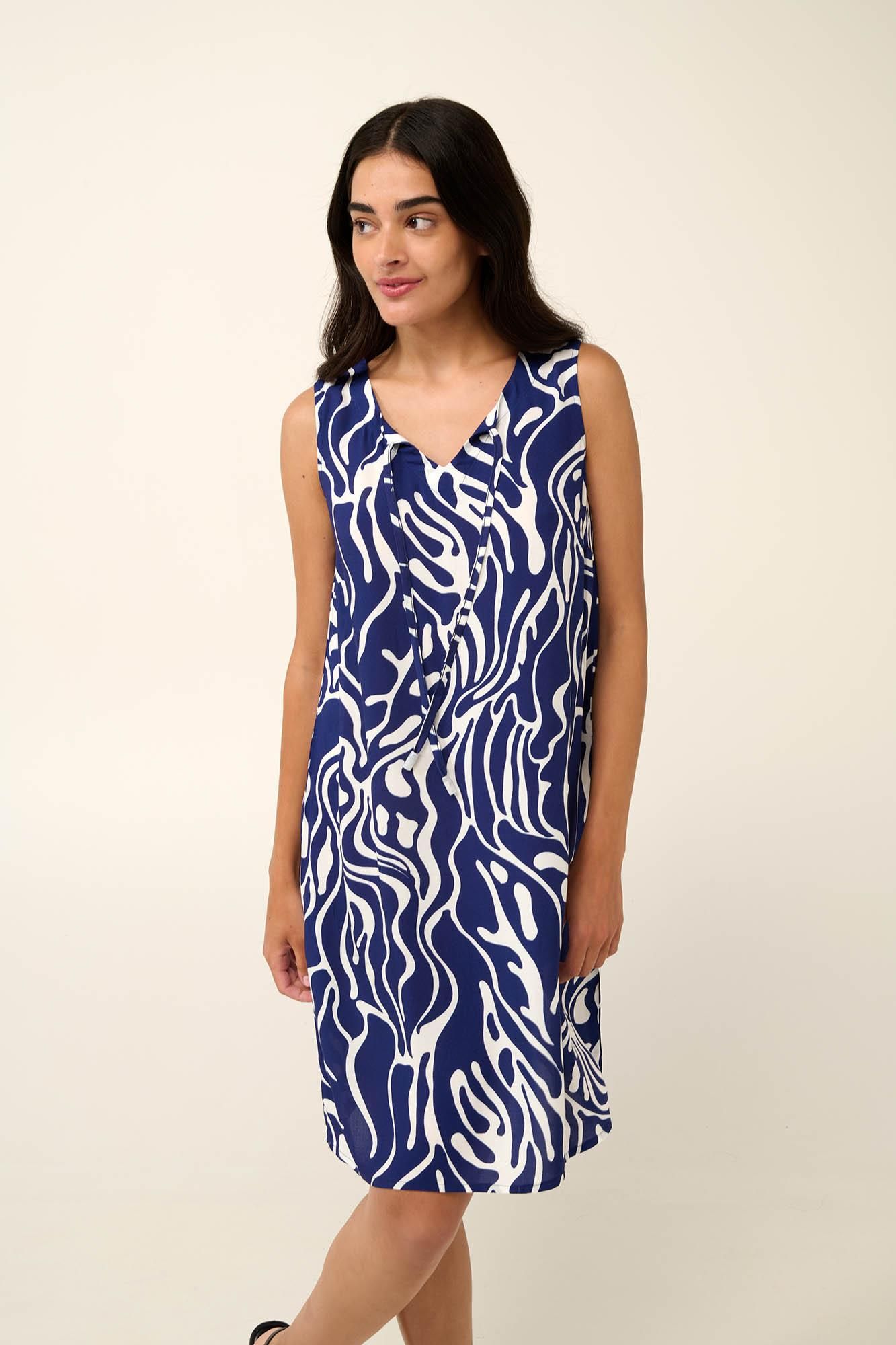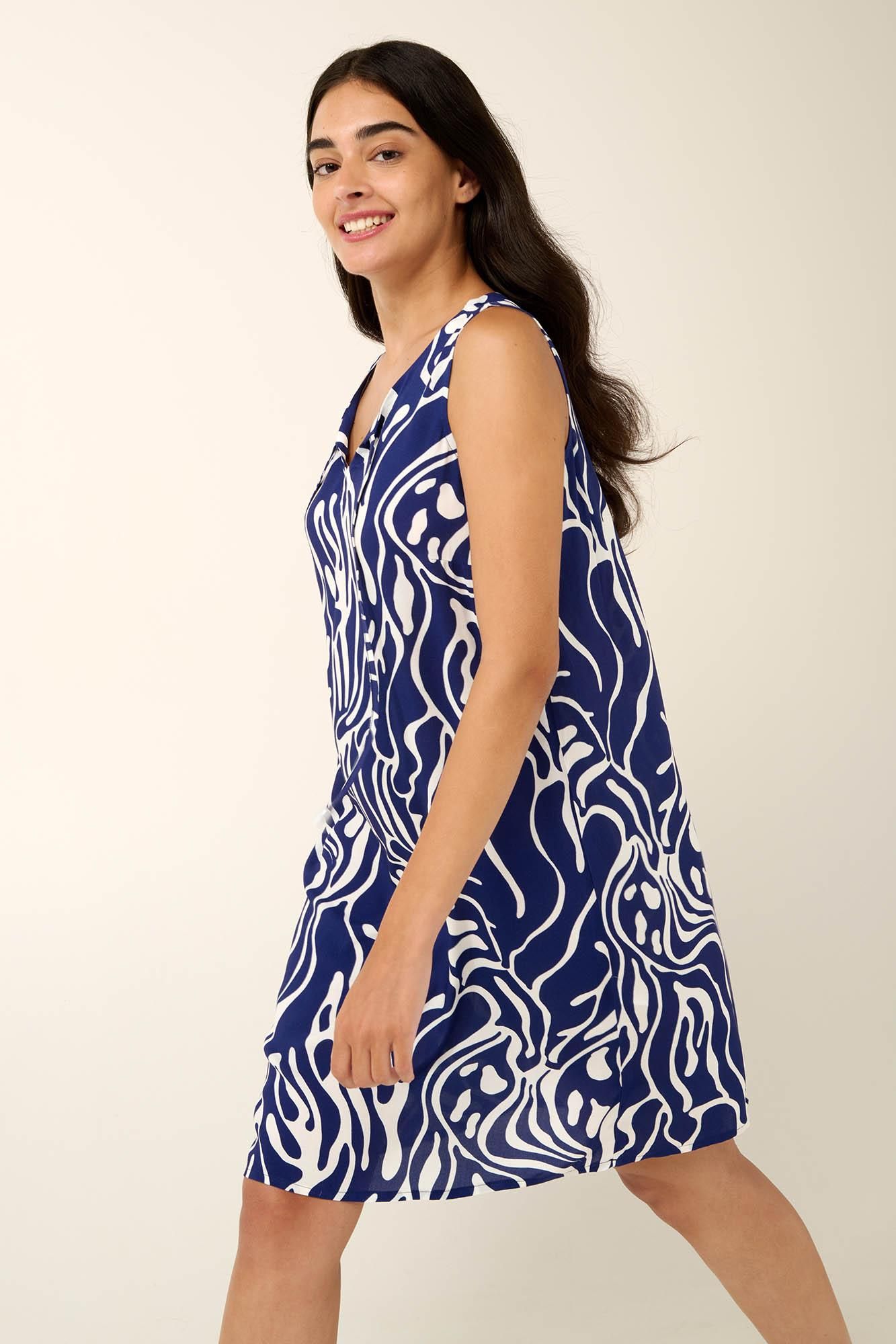 Ένα ελαφρύ και αέρινο καλοκαιρινό αμάνικο φόρεμα που θα αγαπήσετε τις πιο ζεστές ημέρες. Σχεδιασμένο με κολακευτική λαιμόκοψη V που δένει μπροστά σε μοτίβο που θυμίζει έντονα τη θάλασσα και τον ουρανό του Αιγαίο. Είναι κατασκευασμένο από viscose ποπλίνα που θα σας βοηθήσει να μείνετε δροσερή και ανάλαφρη κάθε στιγμή. Φορέστε το πάνω από το μαγιό σας στη παραλία ή σε μια χαλαρή βόλτα στις διακοπές
