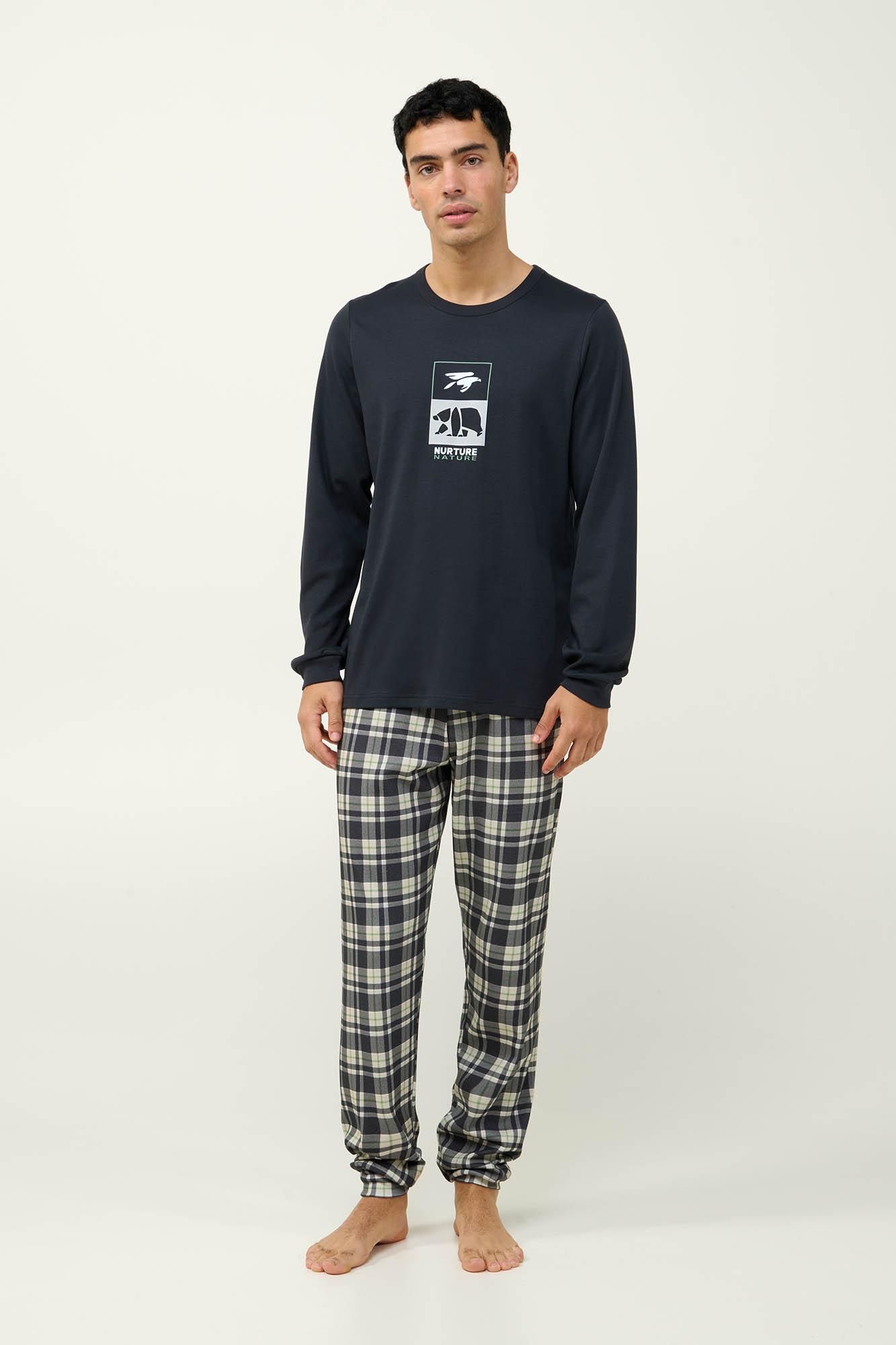 Ανανεώστε τη χειμερινή σας γκαρνταρόμπα με αυτές τις ανδρικές πυτζάμες από 100% ααλό και διαπνέον βαμβάκι interlock. Αποτελείται από μπλούζα με μανσέτες στα μανίκια και τυπωμα στο στήθος εμπνευσμένο από τη φύση. Το σετ συμπληρώνει ένα μακρύ, καρό παντελόνι με μανσέτες. Μια ιδανική επιλογή για άνετες στιγμές στο σπίτι.