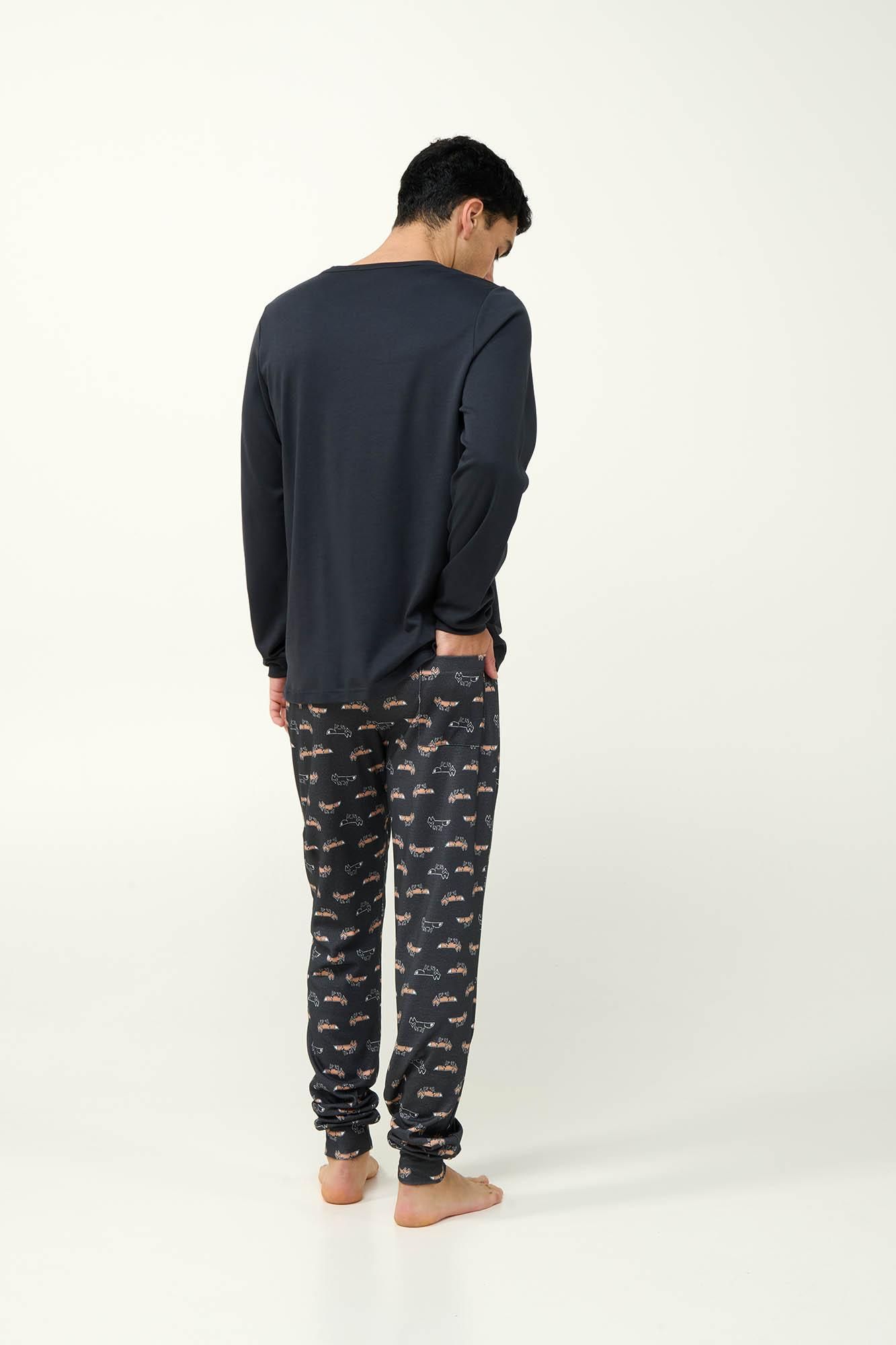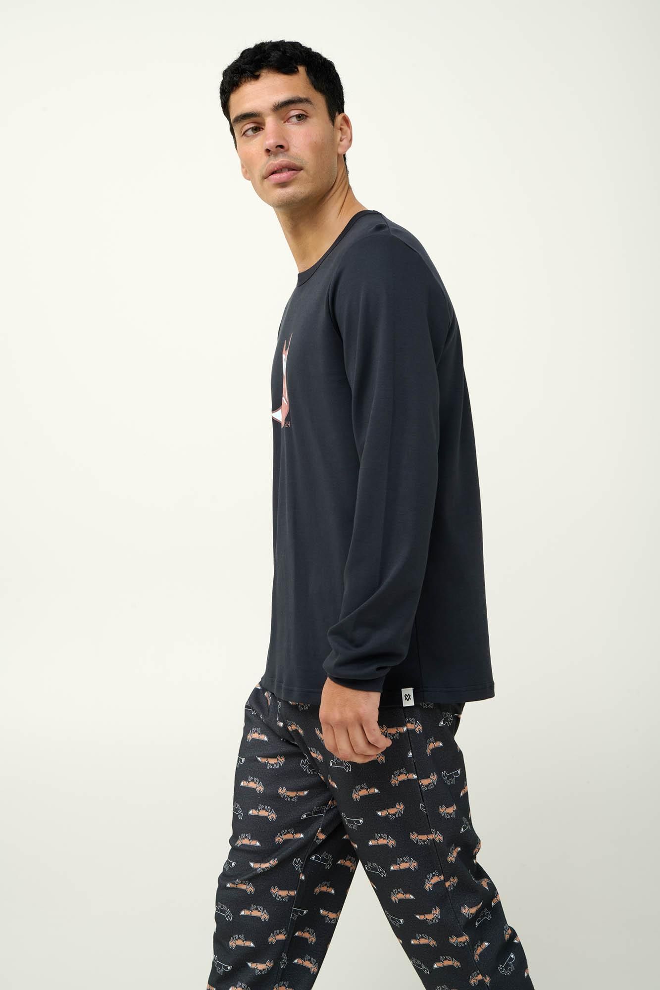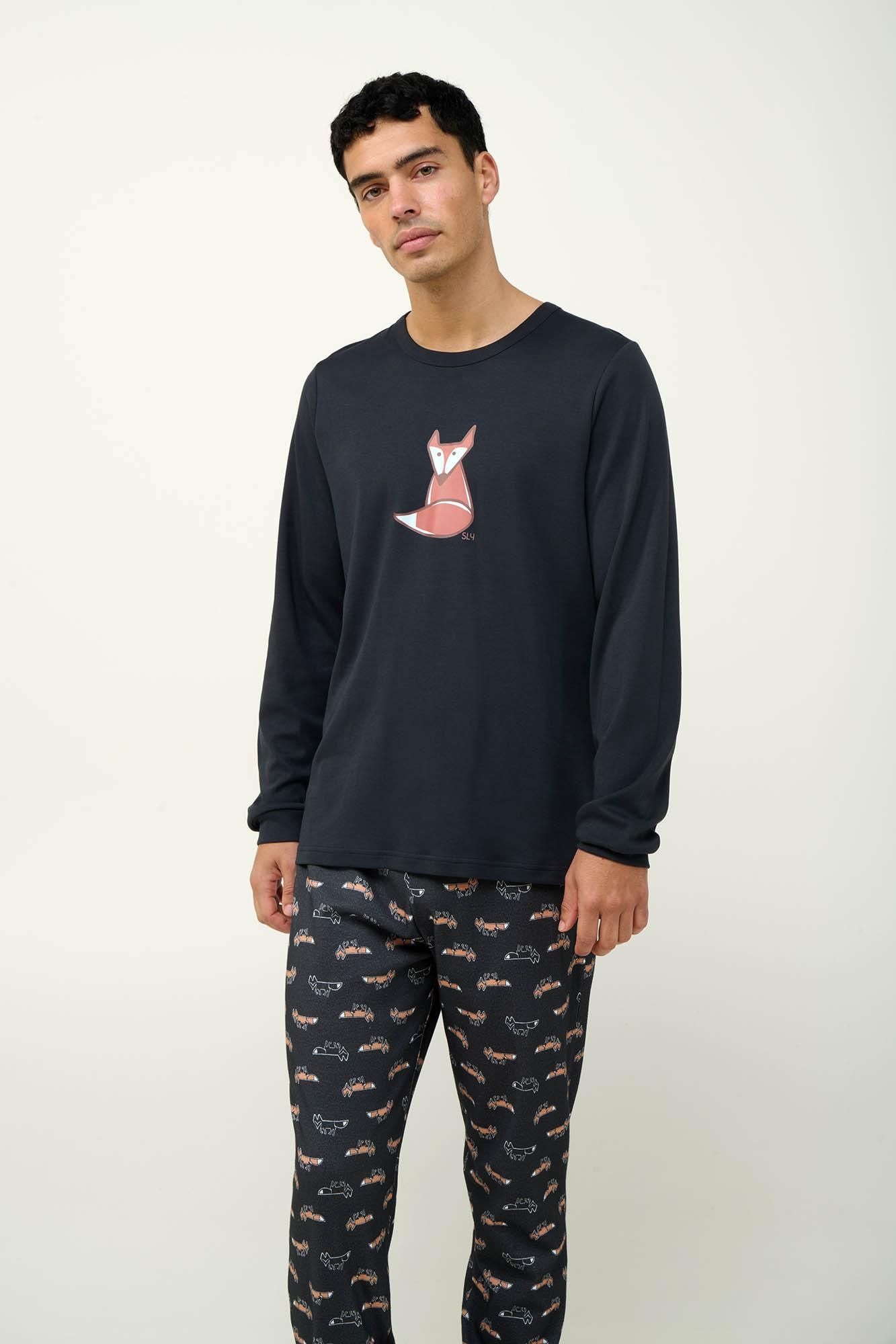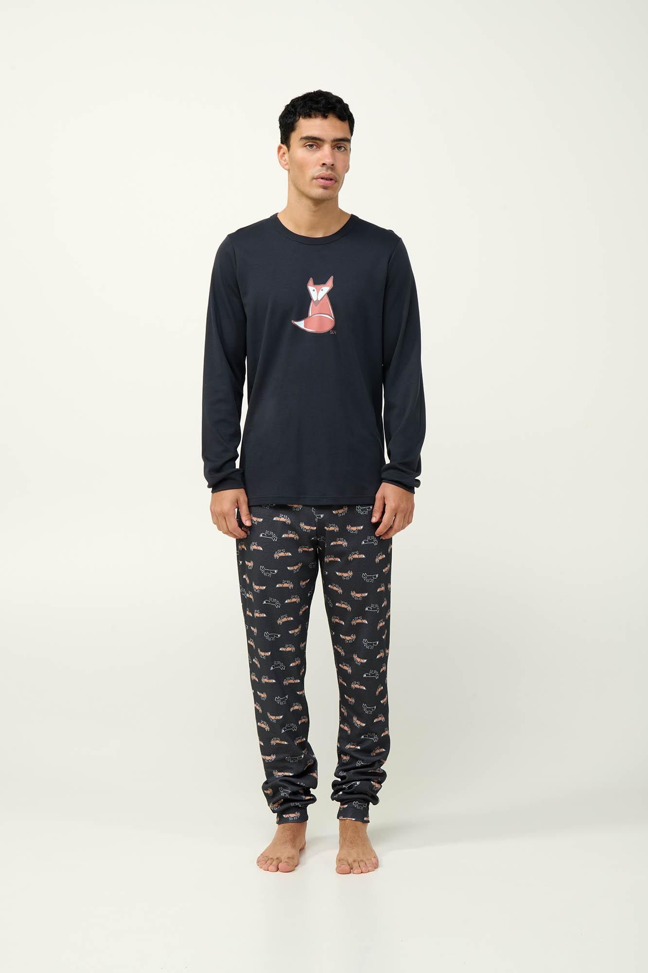 Απολαύστε κάθε στιγμή με αυτές τις ανδρικές χειμερινές πυτζάμες, φτιαγμένες από100% βαμβάκι interlock για απαλή αίσθηση και φυσική διαπνοή. Το πάνω μέρος έχει μανσέτες και μια χαριτωμένη αλεπού στο στήθος, προσθέτοντας μια ευχάριστη νότα στο σύνολο σας. Το σετ συμπληρώνει ιδανικά ένα παντελόνι με μανσέτες και all-over μοτίβο με αλεπούδες, προσφέροντας άνεση και στιλ. Με χαλαρή εφαρμογή και απαλή υφή, είναι η ιδανική επιλογή για στιγμές χαλάρωσης ή έναν ξεκούραστο ύπνο.