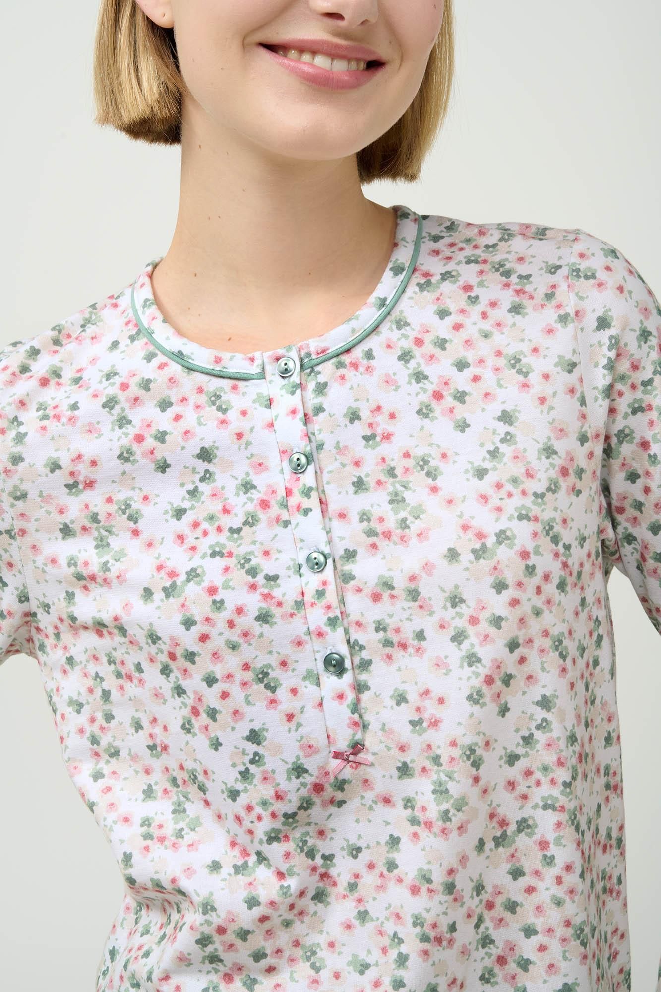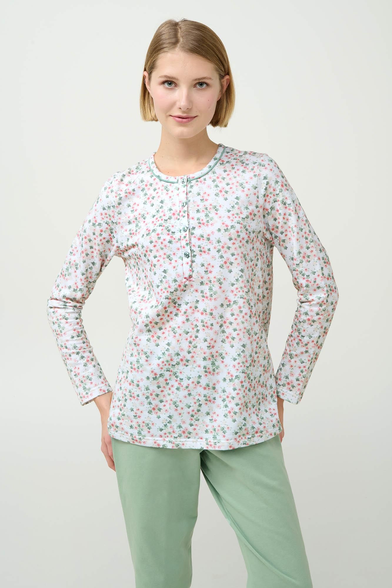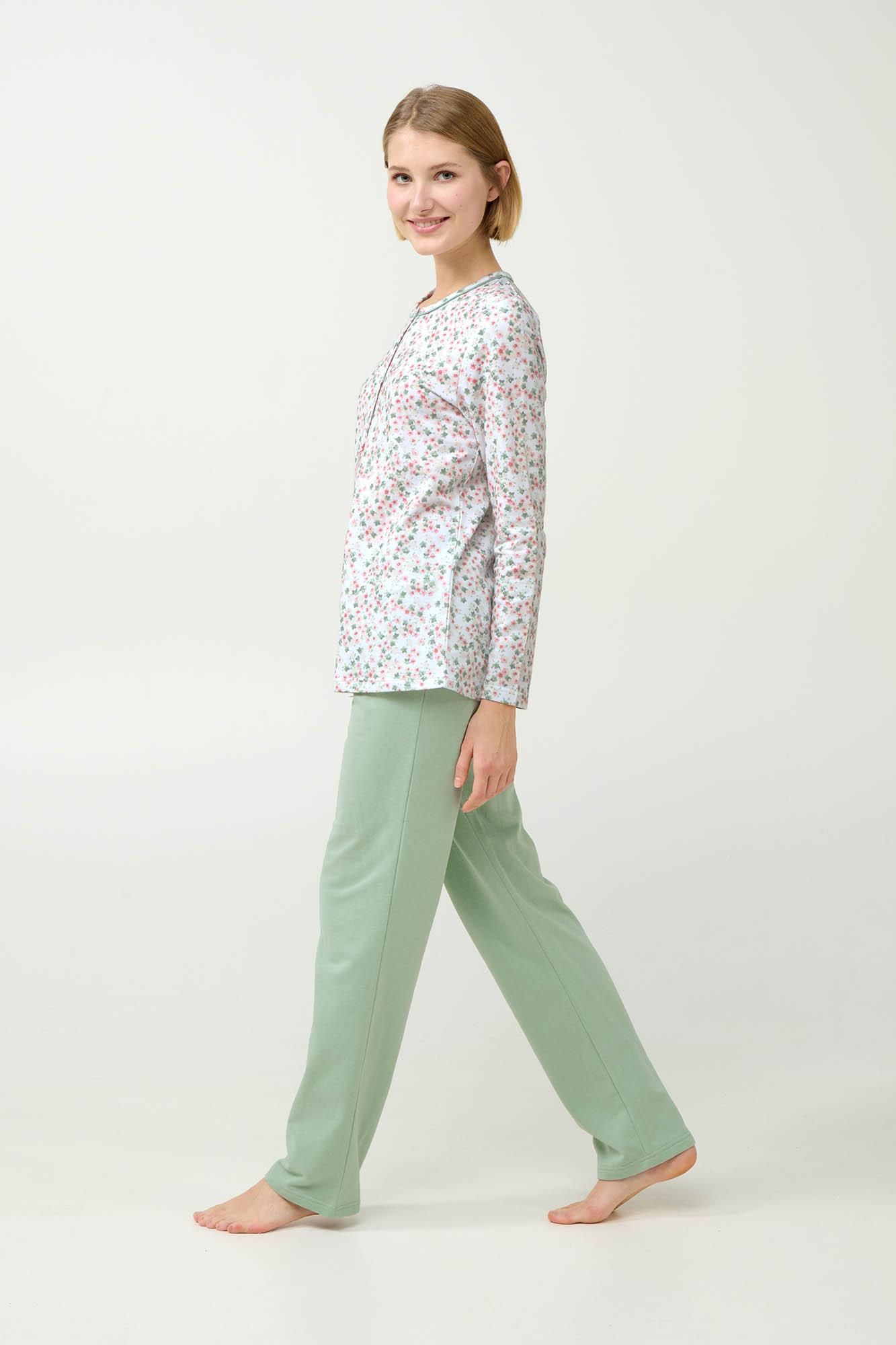 Επιλέξτε για τις κρύες ημέρες του χειμώνα ένα σετ γυναικείες πυτζάμες, κατασκευασμένο από υψηλής ποιότητας 100% βαμβάκι φούτερ που προφέρει φυσική ζεστασιά και διαπνοή. Το επάνω μέρος ξεχωρίζει με ένα ρομαντικό φλοράλ μοτίβο και κλασική πατιλέτα που προσθέτουν διαχρονική γοητεία, ενώ το μονόχρωμο παντελόνι διατηρεί χαρίζει ισορροπία στο σύνολο. Ιδανικό για στιγμές χαλάρωσης ή έναν ήρεμο ύπνο.