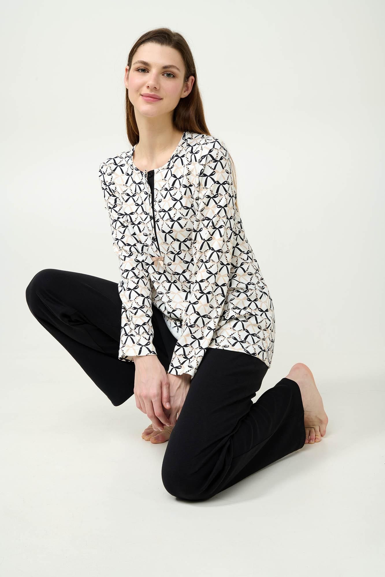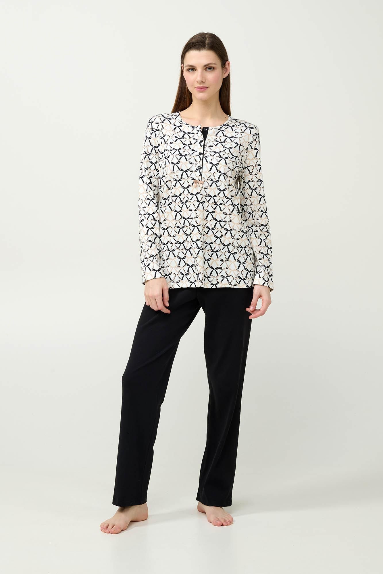 Αυτή η γυναικεία πιτζάμα είναι φτιαγμένη από απαλό και ανθεκτικό 100% βαμβακερό interlock, προσφέροντας εξαιρετική διαπνοή και άνεση. Το πάνω μέρος διαθέτει κομψό μοτίβο με φιόγκους σε όλη την επιφάνεια και πατιλέτα με κουμπιά για εύκολη εφαρμογή, συνδυάζοντας κλασικό στυλ με μοντέρνα πινελιά. Το σετ συμπληρώνεται από μονόχρωμο παντελόνι σε μαύρο χρώμα, που χαρίζει ισορροπία στο σύνολο. Ιδανική επιλογή για χαλάρωση στο σπίτι ή έναν άνετο ύπνο.