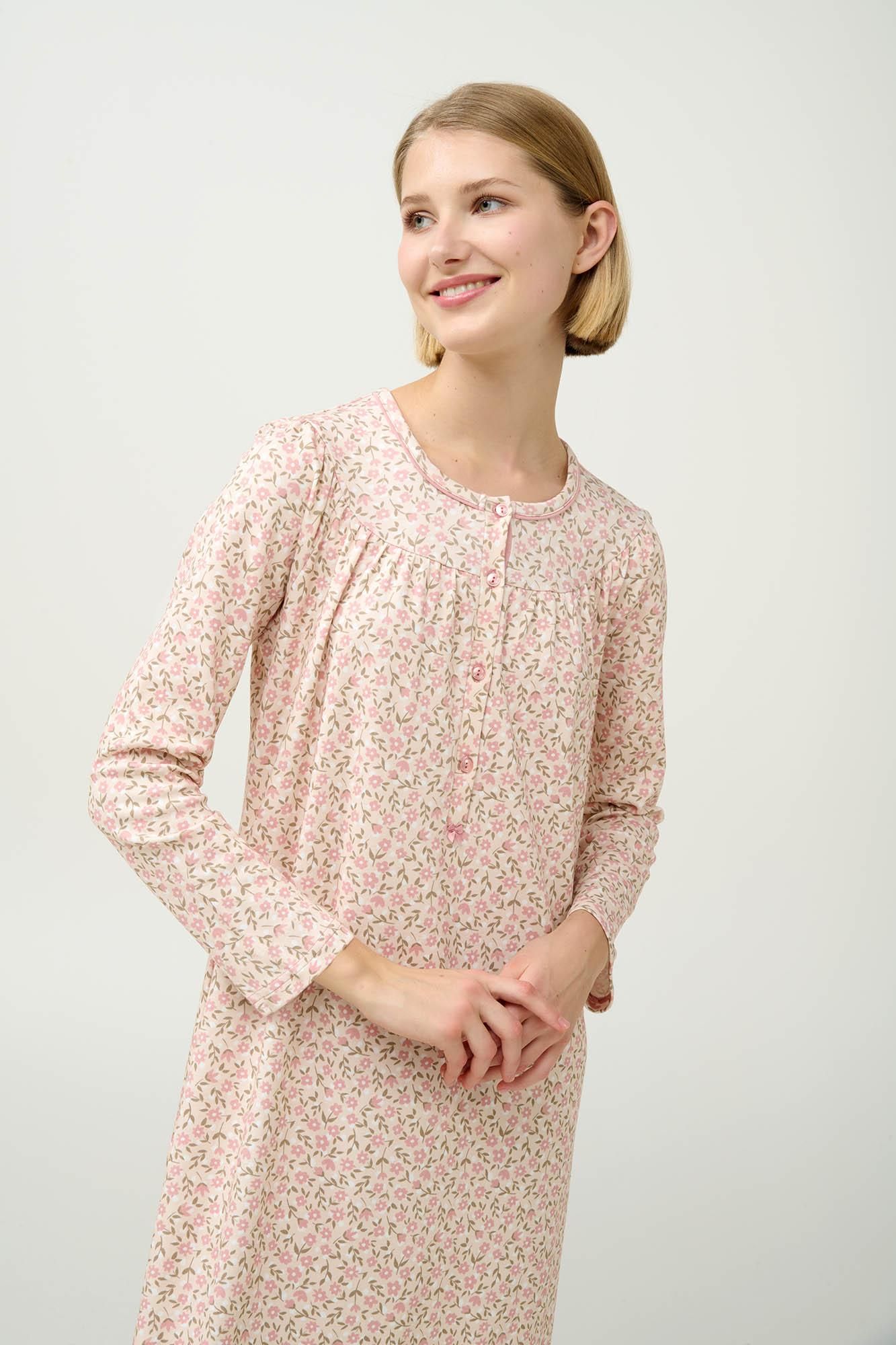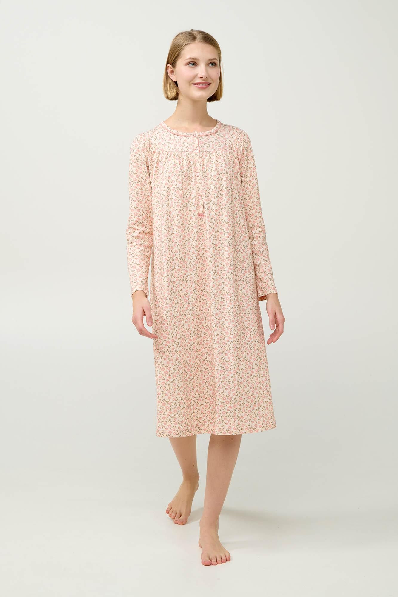 Προσθέστε στη συλλογή σας ένα κλασικό νυχτικό από 100% βαμβάκι interlock, που προσφέρει απαλή, διαπνέουσα αίσθηση στο δέρμα. Σχεδιασμένο με πατιλέτα και μακριά μανίκια σε απαλό ροζ φλοράλ μοτίβο που χαρίζει διακριτική θηλυκότητα και ρομαντικό χαρακτήρα. Ιδανικό για ήρεμα βράδια και χαλαρά πρωινά, αυτό το διαχρονικό σχέδιο συνδυάζει κομψότητα και άνεση στην καθημερινότητά σας.