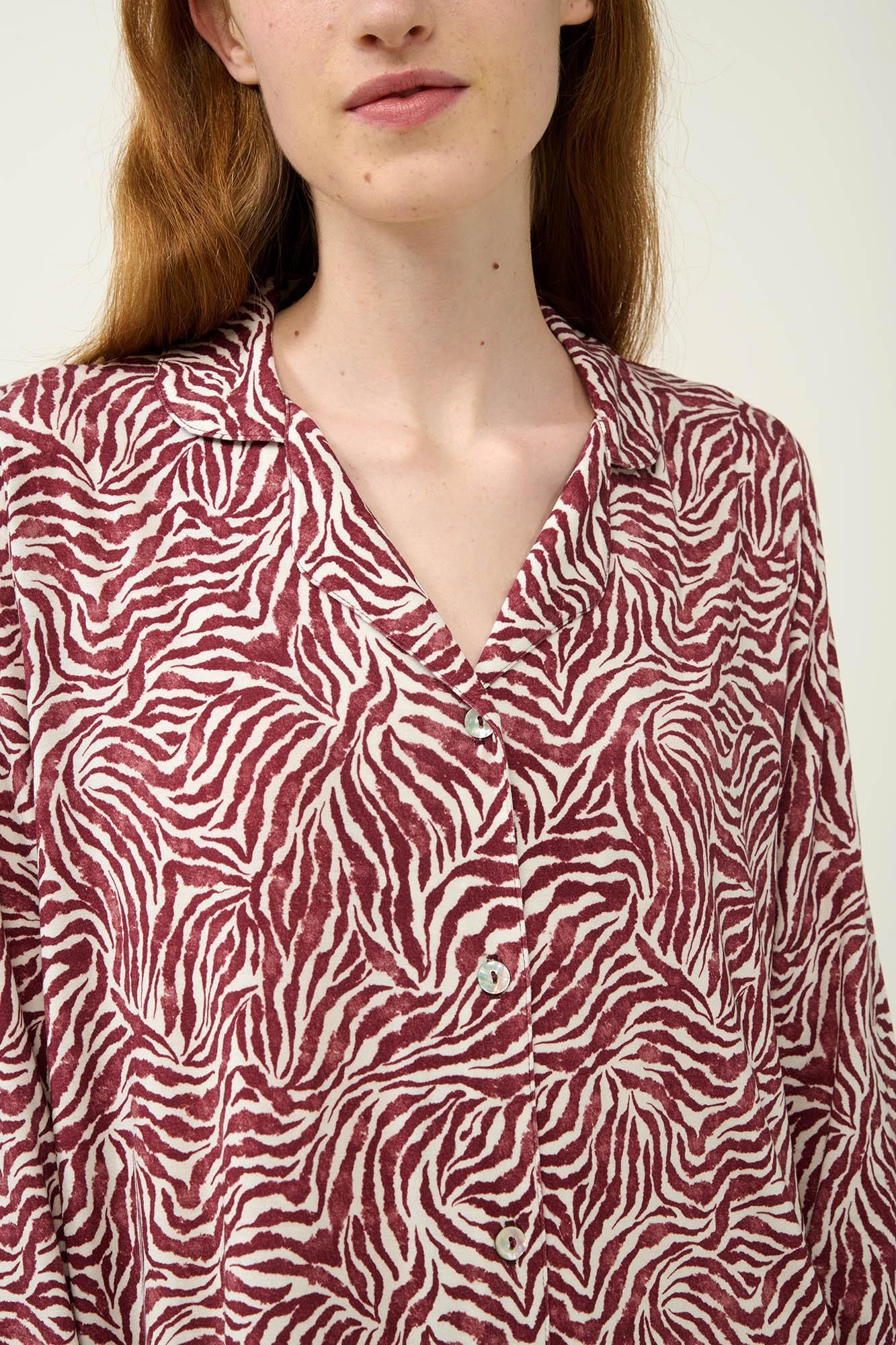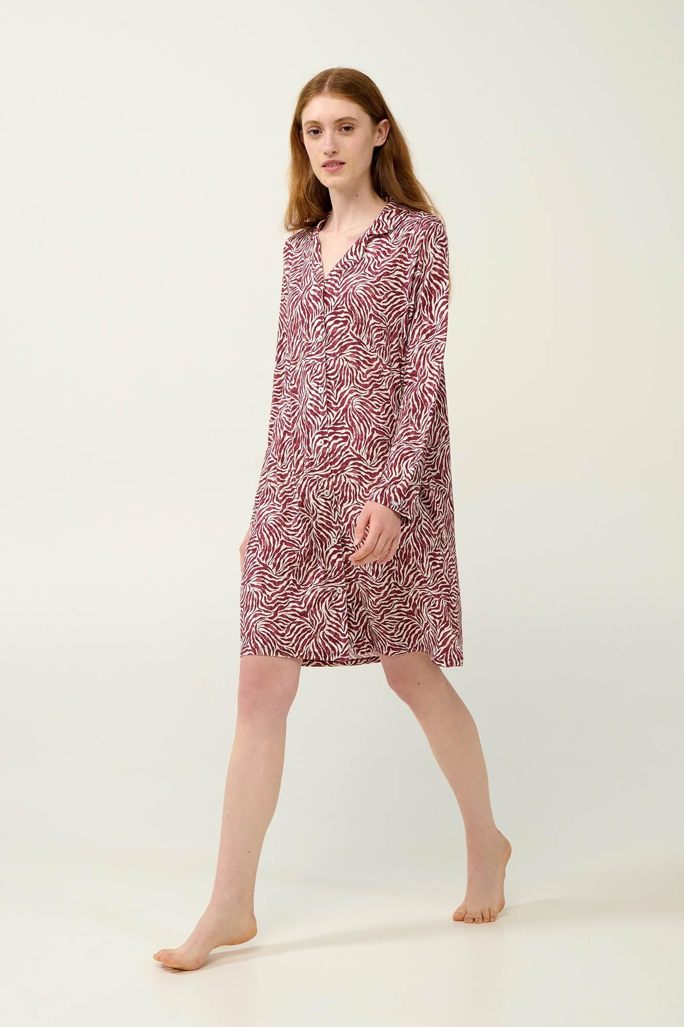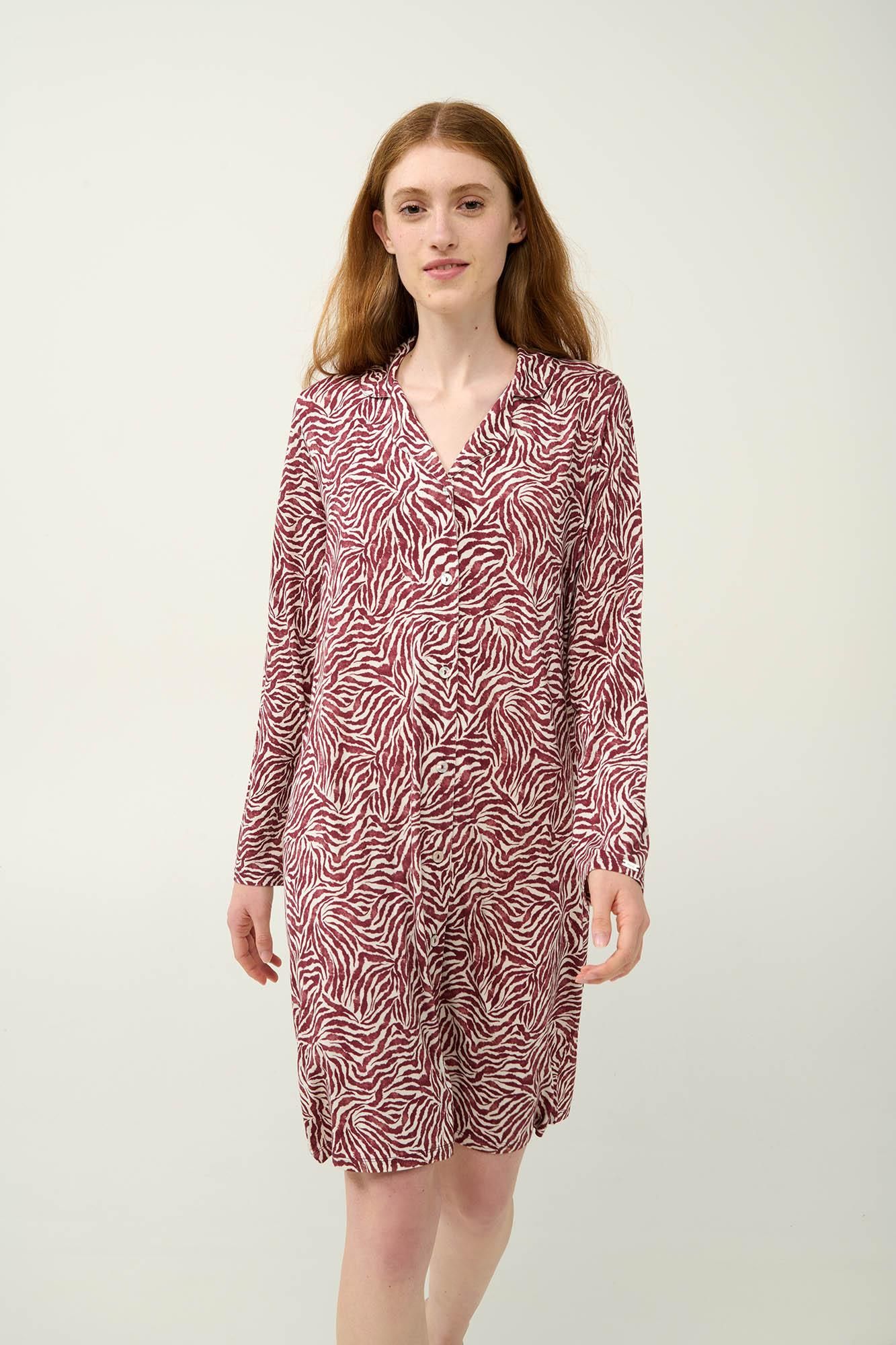 Ανανεώστε τη συλλογή σας με αυτό το κομψό νυχτικό σε μπορντό και λευκό ζέβρα μοτίβο, που συνδυάζει στυλ και άνεση με διακριτική πολυτέλεια. Κατασκευασμένο από ύφασμα LENZING Tencel Modal Micro, προσφέρει μεταξένια απαλότητα και υπέροχη αίσθηση στο δέρμα. Το κλασικό κουμπωτό μπροστινό μέρος διαχρονικό χαρακτήρα και πρακτικότητα, ενώ τα μακριά μανίκια εξασφαλίζουν ευχάριστη αίσθηση τις κρύες ημέρες του χειμώνα. Σχεδιασμένο με προσοχή στη λεπτομέρεια, αυτό το νυχτικό είναι ιδανικό για τις στιγμές χαλάρωσης στο σπίτι και έναν άνετο ύπνο