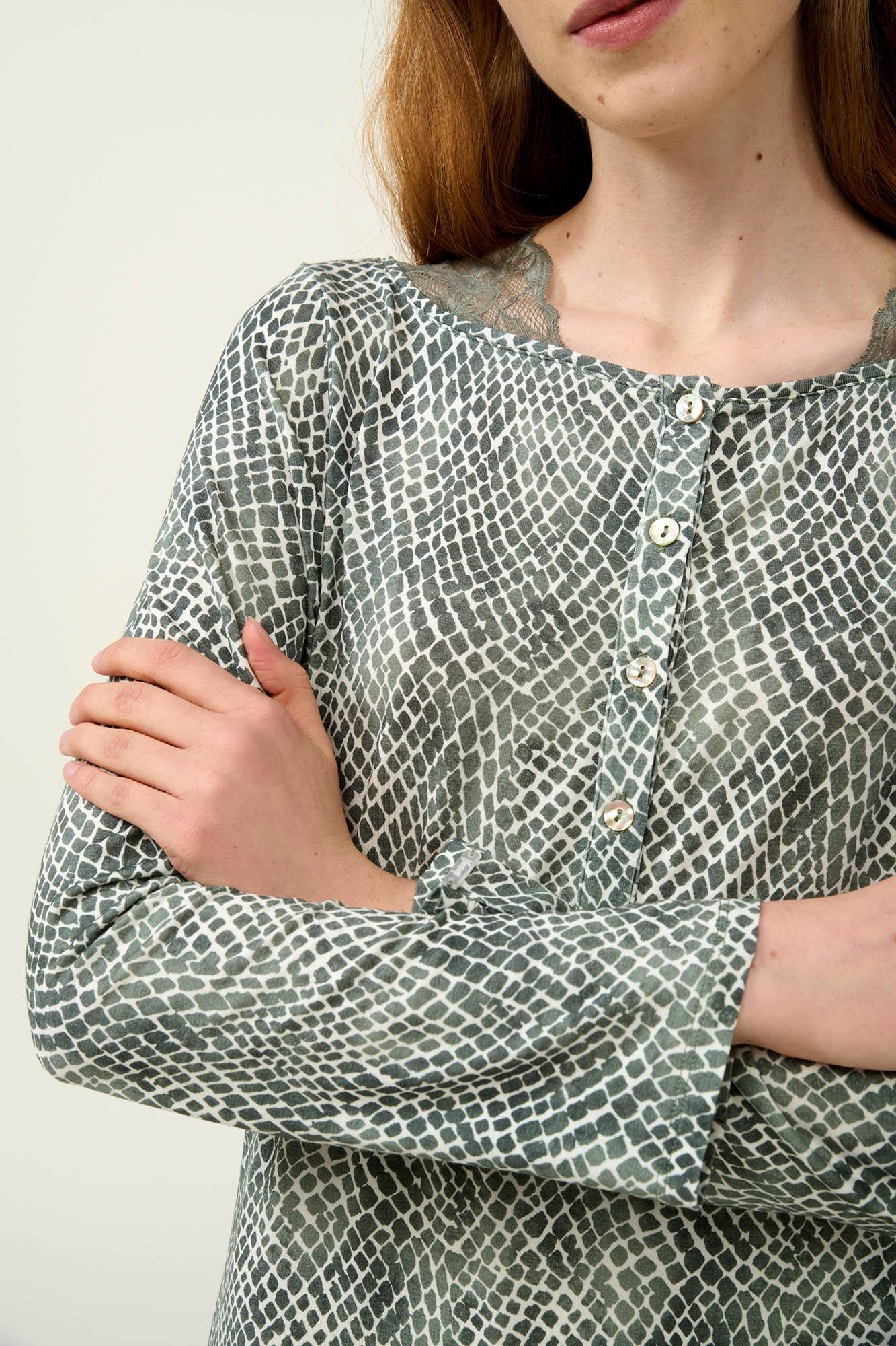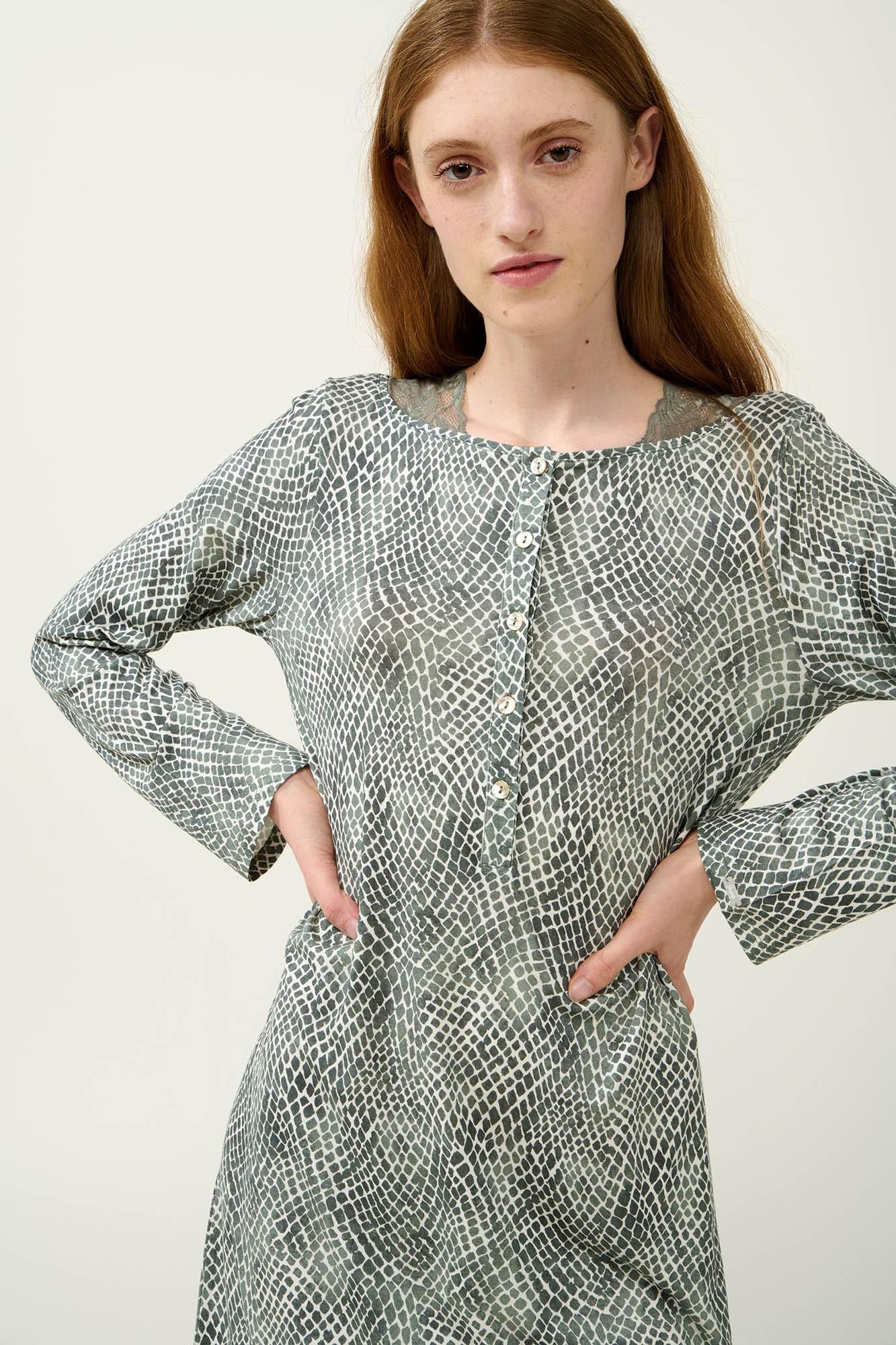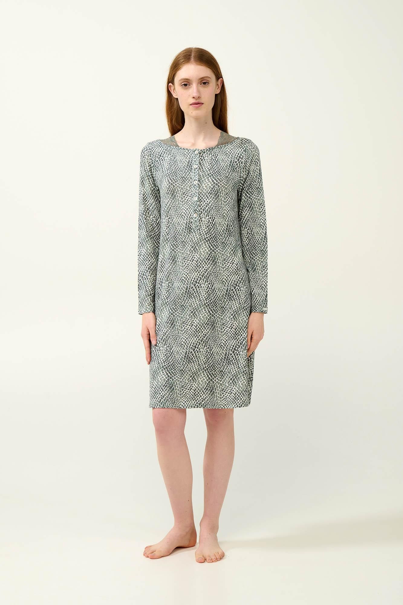 Επιλέξτε ένα χειμερινό νυχτικό που συνδυάζει κομψότητα και άνεση, ιδανικό για τις στιγμές χαλάρωσης στο σπίτι ή τον ύπνο. Είναι κατασκευασμένο από απαλό LENZING Tencel Modal Micro, που επιτρέπει στο δέρμα να αναπνέει και αγκαλιάζει ευχάριστα το σώμα . Διαθέτει πατιλέτα, μακριά μανίκια και διακριτικές λεπτομέρειες δαντέλας, που προσθέτει μια νότα θηλυκότητας. Μια εκλεπτυσμένη εκδοχή του animal print αποτυπώνεται σε μια ιδιαίτερη πράσινη ανθρακί απόχρωση, χαρίζοντας στο σχέδιο έναν σύγχρονο και διακριτικό χαρακτήρα