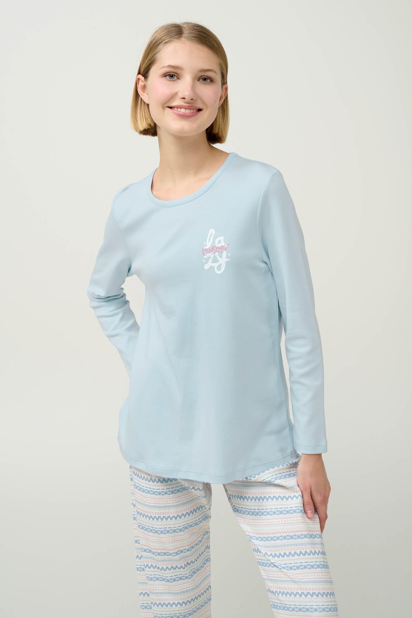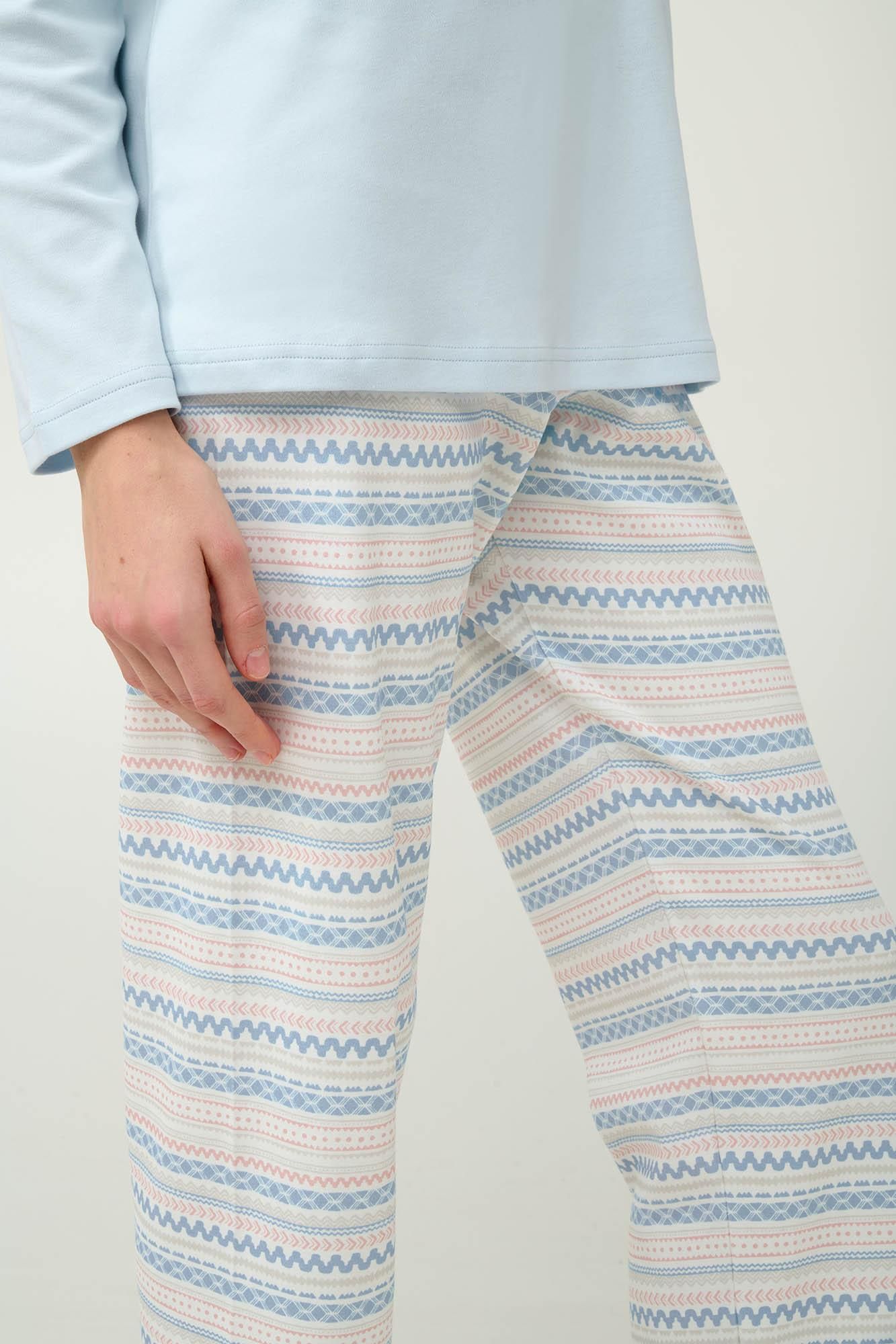 Προσθέστε στη συλλογή σας αυτές τις γυναικείες πυτζάμες, κατασκευασμένες από υψηλής ποιότητας 100% βαμβάκι interlock. Το γαλάζιο τοπ διαθέτει μακριά μανίκια και κανονική εφαρμογή για άνεση και ελευθερία κινήσεων, ενώ το παντελόνι είναι διακοσμημένο με ένα σκανδιναβικό μοτίβο σε παστέλ αποχρώσεις που ενισχύει το χειμερινό του χαρακτήρα. Σχεδιασμένο για να απολαύσετε τις στιγμές χαλάρωσης ή με διαχρονικό στυλ και μέγιστη άνεση.